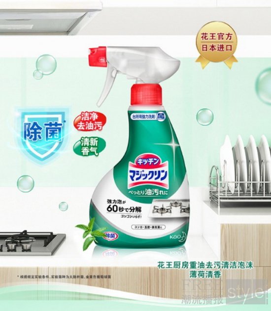 日常烹饪的煎炒煮炸使厨房的油污累增,厨房中的重油污、滋生的细菌及刺激性的气味等是多数人清洁工作中的烦恼。 “花王厨房重油去污清洁泡沫”一出手,感觉跟从前大不相同。绵密泡沫可快速溶解深层油污,轻松清洁炉灶、烤架、油烟机、换气扇、操作台、瓷砖、水槽等重油区的同时还可以有效除菌*。产品中的清新薄荷香,能令厨房保持清新舒爽的气味。(*根据规定实验条件,实验菌种为大肠杆菌,金黄色葡萄球菌。)
