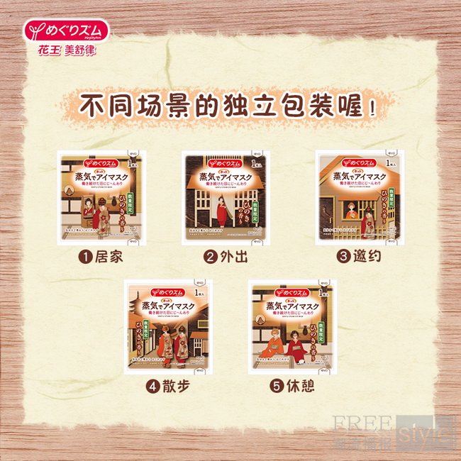 “花王美舒律蒸汽眼罩雪松香型”的包装古朴典雅,每个独立包装似乎勾勒出和风式的日常生活画卷,不同的场景的独立包装在使用时更增添不同乐趣。