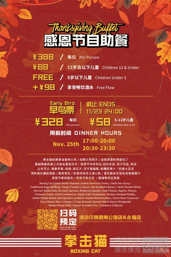 刚从万圣节盛大派对落幕,转而迎来更激动人心的感恩节之夜。感恩节火鸡作为拳击猫一年一度的隆重传统,今年依旧不会缺席。拳击猫思南店、永福店及新天地旗舰店,已严阵以待,为你呈上9-10KG传统炸火鸡。
