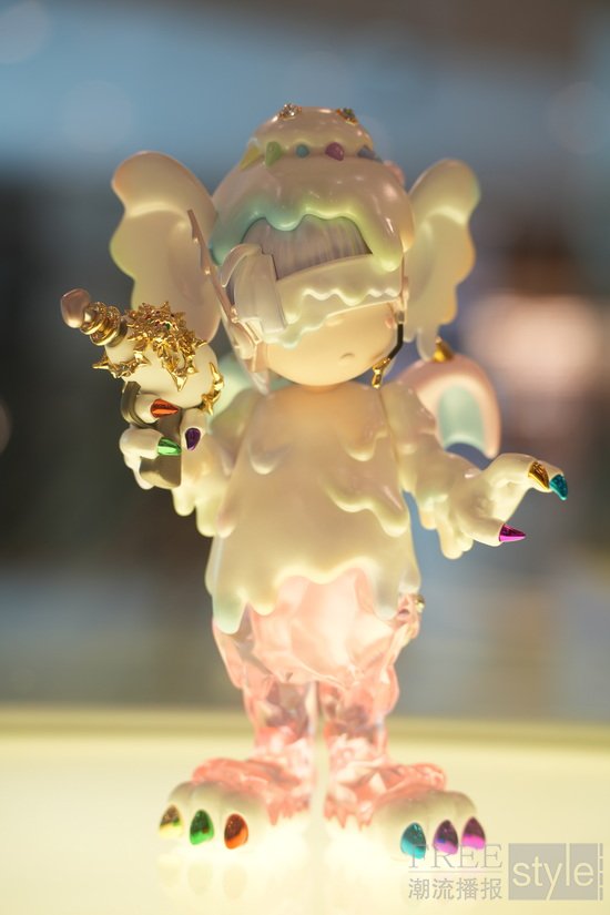 Marsper静坐在简约白王座上,头顶三个圆圈交叠交织成图腾,顶端点缀星瓣,星辉与花瓣在光中交融。光影、图腾与Marsper交汇,仿佛沉入爱与魔法交织的梦境,成为这场潮流之旅的见证者。这里陈列着多款经典Marsper展品,涵盖品牌联名款、大师款、限定款等多个系列。