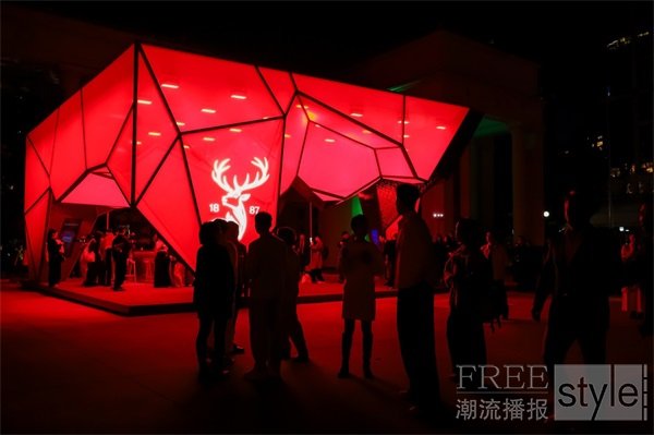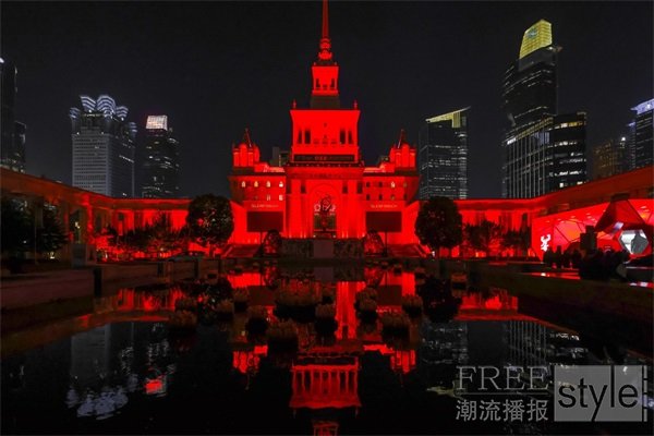 当夜色渐入佳境,真正的华彩乐章于地标奏响。标志性的红色光晕点亮上海展览中心主立面,层层浸染,直至亮起巨大的格兰菲迪徽标。这场恢弘的城市级视觉盛宴,以极具冲击力的方式,向全城宣告格兰菲迪XS系列的耀目问世。