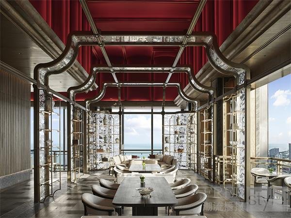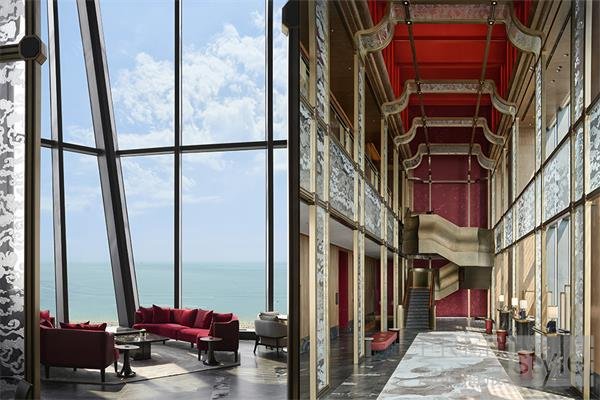 入口庭院中,著名艺术家任天进创作的白铜胡杨雕塑《千年》静立,以不朽材质凝铸时间力量,为空间注入坚韧而沉静的精神意象。穿庭而入,一座名为《启云》的当代艺术雕塑便映入眼帘,由著名雕塑大师隋建国创作,借现代材质与科技语言解构道家“有无相生”的哲思,生命痕迹隐于造型肌理,静立迎候八方来宾。首层抵达大堂萃取“海上第一名山”崂山灵韵,化作府邸专属玄关,宾客在此稍作休憩,便可乘梯直上 51 层空中大堂。登梯而至的雅境中,顶天立地的博古架巧借苏式框景之法,将海天一色收作流动画卷,亭榭形制的玻璃屏风疏朗有致,铜色旋转楼梯如飞龙踏云蜿蜒,传统意象经当代手法焕新。市花耐冬、海洋纹样等本土元素不着痕迹地融入动线。前一秒是海韵入怀的恢宏,转角便遇艺术长廊的典雅,真正实现“一步一景,步移景异”,于方寸之间尽览东方美学的万千气象。