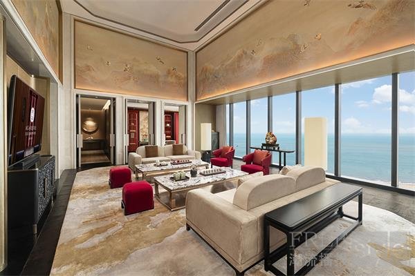 酒店共设116间客房,每一间都承载着“府邸”的居住美学。客房分别以“海洋蓝”“夕阳金”“中国红”为主题色调,融合中国宅院的秩序感与青岛山海的自然韵律,构筑出既在地又当代的生活空间。美高梅华府总统套房更藏叙事巧思,以崂山风景为核心脉络,将晨曦微熹、日出霞光、星夜静谧等不同时辰的景致色彩,层层铺陈于卧室、客厅、餐厅等空间,和谐相融,渐次递进。入住其间,仿若栖身崂山胜景之中,亲历山间时光流转的静谧与灵动。