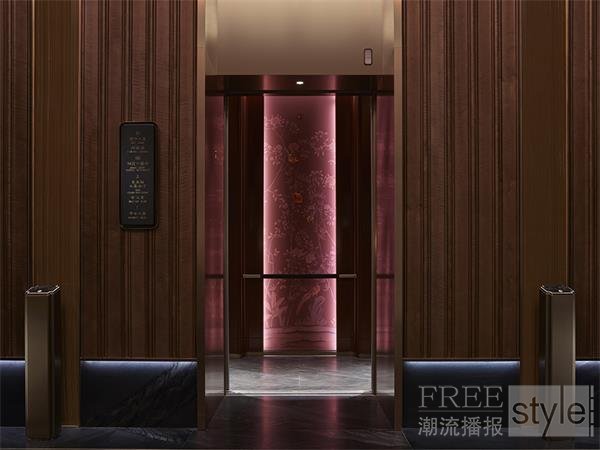 电梯轿厢亦暗藏巧思:灵感源自古典轿辇,以考究的木艺、温润的锦缎和精巧的真丝刺绣,复刻出那份独有的尊贵与仪式感,于起落之间,尽显现代东方的匠心风骨。