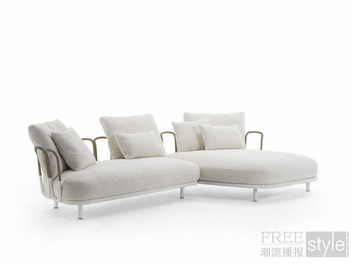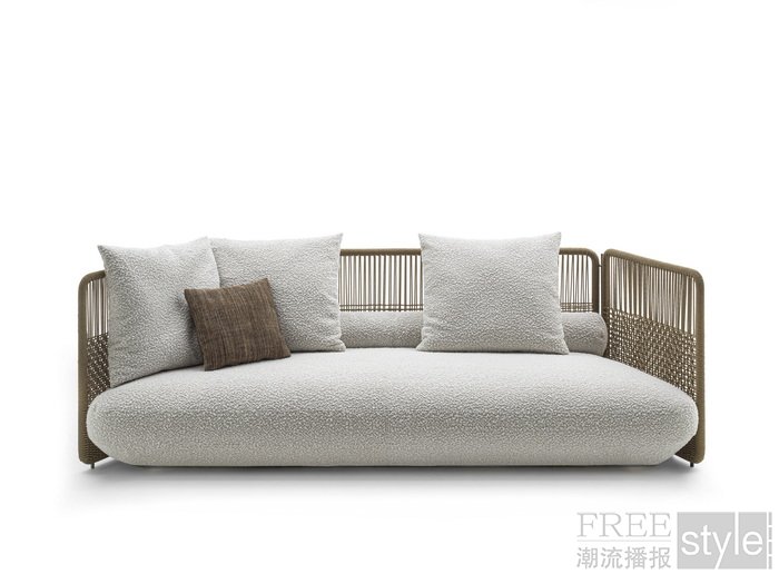 经过柔和弯折塑形的钢结构,在扶手与靠背处勾勒出覆有绳编包层的优雅花瓣造型。结构表面覆以环氧粉末涂层,呈现雅致色调,并与聚丙烯绳的多种配色方案彼此呼应。比例宽裕、填充柔软的软垫完善了这一为恒久使用而构想的系统,并邀请人们沉浸于那种富有修养的“甜美闲逸”之中,这正是曾让一个时代成为经典的精英阶层所特有的生活情调。
