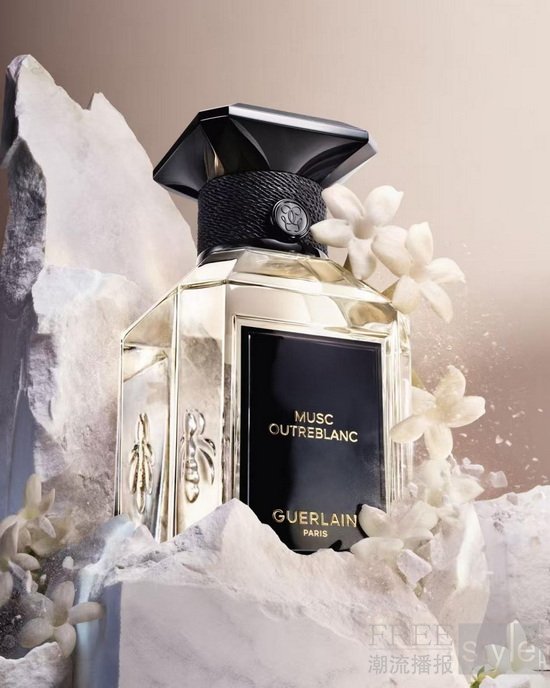 瓶肩上的黑色亮面瓶塞顶端呈八角形,搭配刻有双G标志的金色嵌片。从正面看,瓶塞形状让人联想到传统的覆膜封瓶法,而印章则呼应了蜡封传统。最后,由九条黑线编织而成的精致饰边缠绕瓶颈,彰显娇兰所珍视的编结艺术。同时,这三种元素是对娇兰工坊女工艺师们(Dames de Tables)专业技术的致敬。白色的钟形包装盒饰以优雅的编织纹样,并贴有与瓶身相同的黑色标签,上面点缀着娇兰徽记—— 一只金色小蜜蜂。