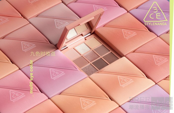 全新3CE九色时妆盘,囊括四大质地:麂皮绒雾浓郁呈色、稳固贴妆;欧根纱细闪清透灵动、轻盈融肤,自带通透微光;幻彩纱偏光呈现水感湿色,打造多维层次与幻彩光源;全新打造的缎光膏体带来清透水光、定格流光的妆效表现。多重质地可随心叠加,轻松打造干净精致的日常眼妆。此外,产品配方同步升级,亦赋予更浓郁、更鲜活的显色效果。
