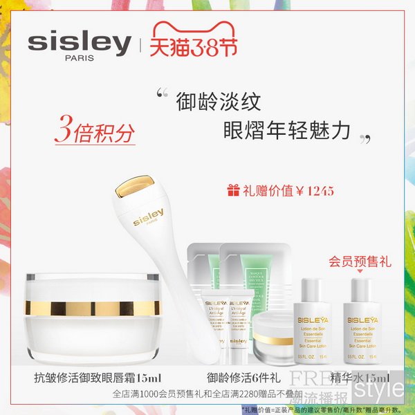 Sisley法国希思黎抗皱修活御致眼唇霜密集滋养眼唇娇嫩肌肤,搭配按摩小金棒,滚走细纹,重焕神采双眸与活力笑颜。天猫3•8节期间,购Sisley法国希思黎抗皱修活御致眼唇霜即赠同款眼唇霜2ml,抗皱修活御致臻颜霜5ml,抗皱修活精华水15ml,紧致修护眼膜3ml*2,礼赠价值高达1120元;2/25-3/4预售期间下单,另加赠抗皱修活精华水15ml,价值125元。