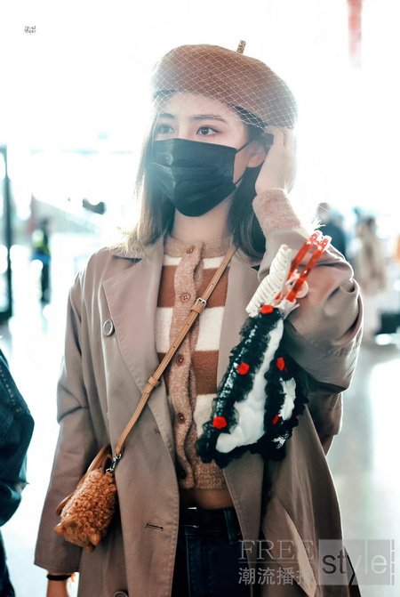 近期,现身机场的许佳琪,卡其色风衣搭棋盘格针织衫,同色系贝雷帽,温暖又时髦的秋日穿搭。