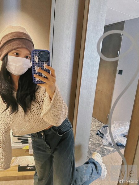 张婧仪对镜子自拍,一顶堆堆帽显脸小,日常搭配出慵懒随性的感觉。