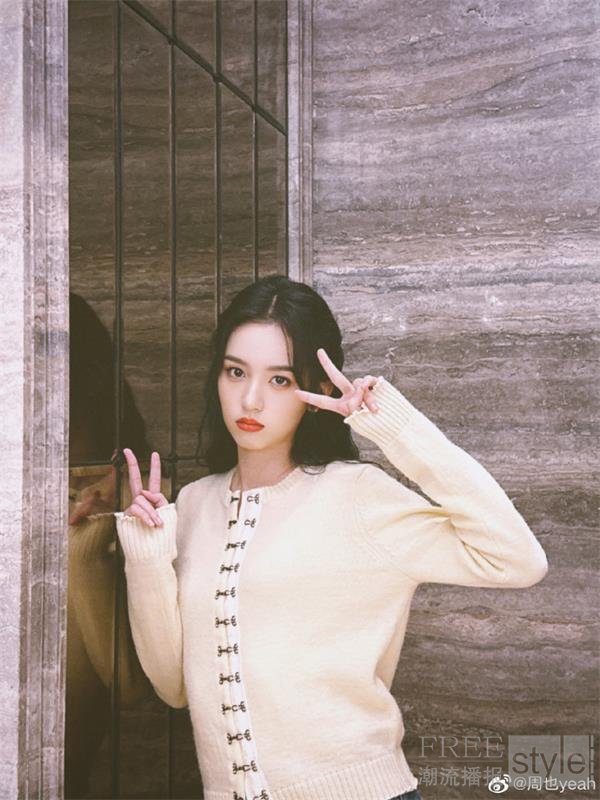 对镜头嘟嘴比耶显俏皮。镜头下的周也看上去状态非常不错,底妆对于妆容整体很重要呢~拥有一个自然的底妆才能让后续妆容变得更完美。