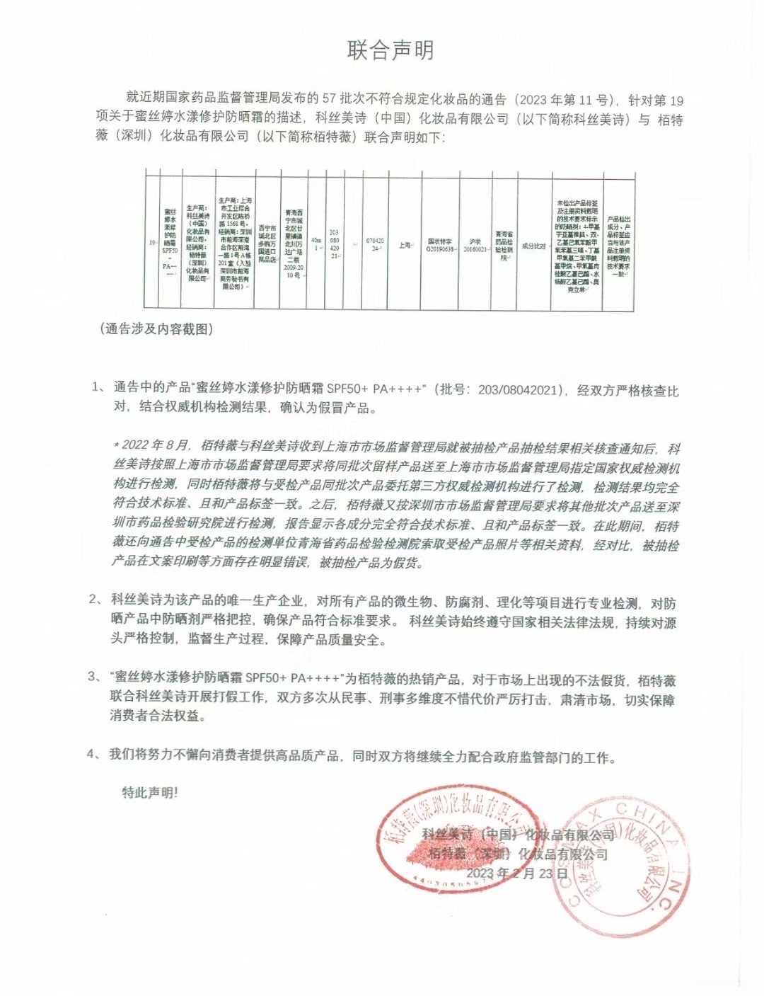 日前(2月22日),国家药监局公示了57批次不符合规定的化妆品信息,其中,显示生产企业为科丝美诗(中国)化妆品有限公司的“蜜丝婷水漾修护防晒霜SPF50+ PA++++”上榜。科丝美诗与蜜丝婷品牌所属公司栢特薇(深圳)化妆品有限公司紧急发布声明,表示双方严格核查比对发现,被曝光的该批次产品并非科丝美诗生产,属假冒伪劣产品。
