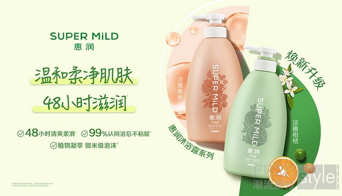 SUPER MiLD 惠润作为FineToday 菲婷丝集团旗下专研植物洗护的代表品牌,以安心的自然植物配方让秀发和肌肤自由呼吸,传递绿色健康的经营理念。惠润进入中国市场已有超过二十年的历史,打造了深受消费者喜爱的洗护系列。现在,惠润核心产品柔净洗护系列和沐浴露系列焕新升级,以全新形象强化温和头皮护理的品牌定位。