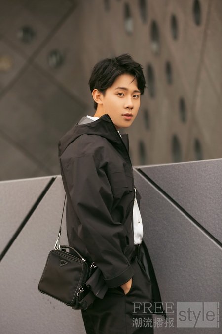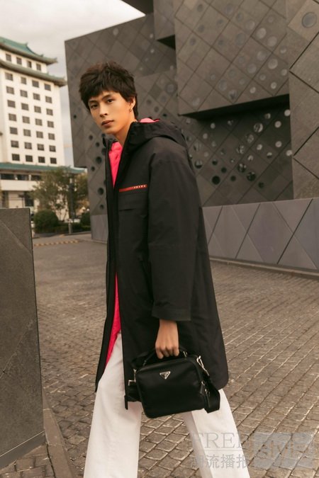 周奇身着Prada Linea Rossa系列外套搭配Prada尼龙Brique单肩包,展露少年活力。