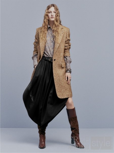 细格纹羊毛剪裁外套搭配飘带装饰棉布衬衫,罗纹针织上衣混搭阔腿裤;风衣风格的腰带、链条腰带在迷你、过膝、及踝长度的褶裥裙上点缀,凸显纤细迷人的腰部线条。工装长裤和都市风短裤这些中性单品,和柔美的垂坠感褶饰衬衣融于一体;方形外套的中性廓形,在本季以柔软的毛羊皮和软皮革重塑。