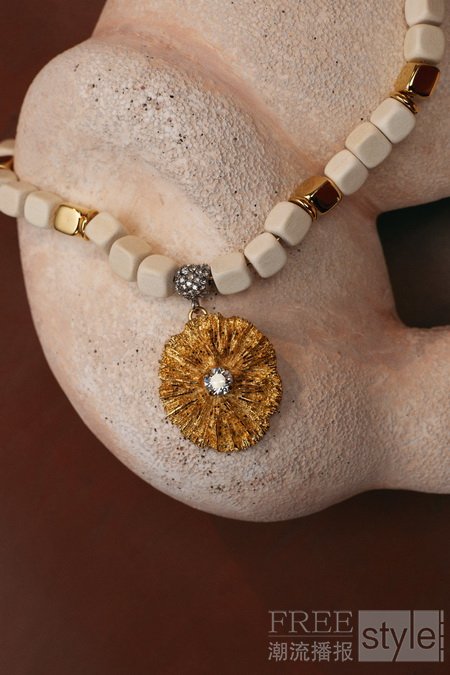 醒目的金属感配饰为这一带有低调华丽质感的系列点睛,从 “Femininities” 硬币项链到齿形吊坠、古典耳环和同款捶打金属手镯。鞋履方面,圆头马靴在本季以平底、系带、扣饰、粗跟等款式出现,其上都带着蜡面皮的饱满光泽。