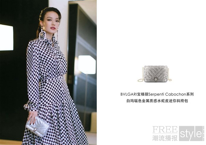 一袭波点长裙配以夸张耳饰,舒淇女王气场十足。宝格丽金属质感Serpenti Cabochon系列迷你斜挎包小巧玲珑,成为整个造型的点睛之笔。如此闪耀的包袋一定会让你在新年聚会中脱颖而出,成为万众瞩目的潮流女孩。
