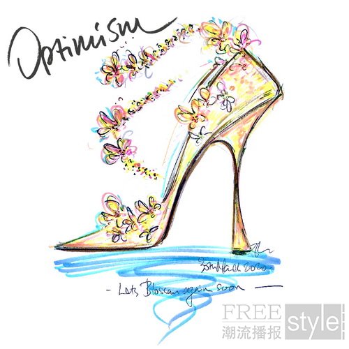 “在这个充满挑战的时刻,保持积极的心态尤其重要。我们的世界正在与一些无形的东西作斗争,这些东西消耗着我们的精神和情感。于我来说,大自然总能在我需要的时候带我暂离喧嚣。在我们的生活被按下暂停键的时候,看着这个世界继续蓬勃生长,让我深受启发。我们的大自然继续着她的节奏。在我的花园里,春天悄然而至,树上的花朵绽放,为黑暗冰冷的‘隧道尽头’射入了温暖的阳光。我们从未经历过这样的时期,但却比任何时候都更需要保持冷静与积极的态度。在我的第一幅CHOO Sketch中,我设计了一只梦幻之履,它的灵感来自花朵的纯美,与无垠的蓝天和金色的阳光形成对比。虽然我们的生活暂停了下来,但大自然依然在编织着她的魔力,帮助我们保持乐观。”