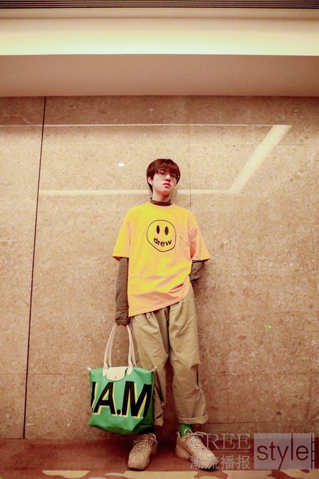 钱正昊手提 My Pliage Signature 个性化定制手提包,湖水绿代表其应援色,印有 J.A.M 是 Jefferson and Money 的黑色字母缩写,醒目黄绿撞色包身尽显潮流个性,背上这款环保再生面料的包包,一起和钱正昊解锁潮流个性新风格,践行环保时尚。
