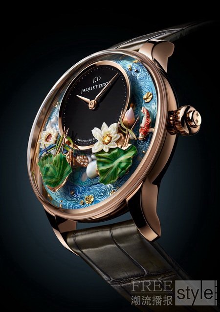 雅克德罗从中国传统文化与雅致美景中撷取艺术灵感,于腕间缔造一幅闲逸静谧的动态东方画卷。在自动玩偶大师的手中,一尾锦鲤被还原到锦鲤幻莲自动玩偶腕表的表盘之上。在长达约4分钟的动态剧目中,它时而从粼粼波纹间时而跃然而出,时而隐秘于莲叶之下,仿若演绎着曼妙芭蕾,在佳节之际传递吉祥祝福,祝颂端午安康。