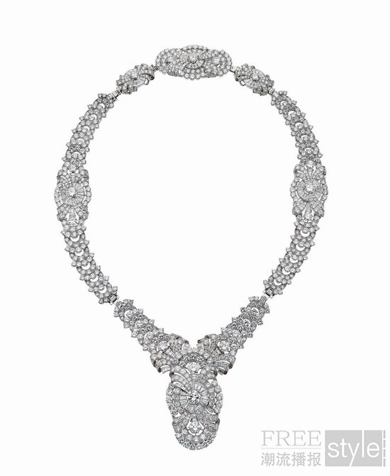 创作于1938年的这款铂金项链早期为坎波隆戈埃托雷•曼佐里尼伯爵(Count Ettore Manzolini )的私人藏品。紧凑密镶的钻石闪烁出耀目光芒,珠宝师用精湛技艺让每颗宝石的切割恰到好处,雕琢出整体规则对称的纹理造型。项链的各个部件环环相扣又高潮迭起,恰如一曲宛转悠扬的乐章,表现出起伏的韵律感。系列耳环与胸针同样镶满钻石,宝格丽的工艺大师运用娴熟的技艺掌控比例,耳环柔美曲线由中央绽放,形成海螺般的造型,在耳边奏响来自大海的交响乐。胸针由三个不同的部分组成,每颗主钻周围环绕着一圈圈精细雕刻的钻石,仿佛石子落入湖面,荡起层次波纹,对称结构和精密的线条透出经典的装饰艺术风采。