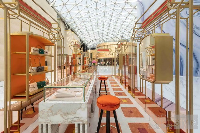 走进店面,定制地毯映入眼帘。饰有正方形几何图案并采用醒目的藏红花色调,其间点缀圆形、正方形与八角星图案。八角星的八条线代表四个基本方位(北、南、东、西)和四季更替(夏至、冬至、春分、秋分)。据传说记载,八角星意为“Roma Caput Mundi”,即“条条大路通罗马”,后来演化成为宝格丽全球精品店的统一标识。展示柜由古罗马建筑中常用的Pavonazzetto大理石材质精心打造,从意大利著名建筑设计师卡洛•斯卡帕(Carlo Scarpa)的作品中汲取灵感,以雕塑造型致敬意大利传统匠心工艺。