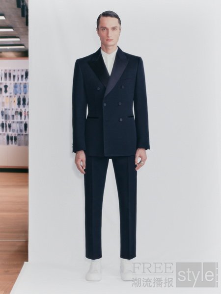 双排扣精裁外套,搭配翻边褶裥长裤,以密织羊毛斜纹面料打造。