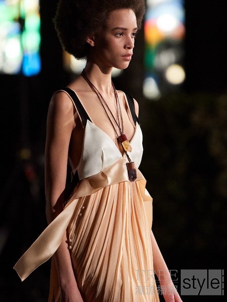 标志性的Chloé风格被重新诠释。比如,扇贝边细节。在1960年于Brasserie Lipp酒馆举办的时装秀上,Gaby Aghion将这一元素运用到了一条早期的棉布连衣裙上。在本季,这一元素成为了乔其纱衬衫上的线迹花纹;有时是皮革花瓣或者牛仔布丁,还以绗缝的形式出现,同时点缀针织衫的袖口。马德拉刺绣的经典风格被摩登、现代的质感取代,成为了针织衫以及皮革单品边缘的装饰性元素。本季的主题图案——彩色大理石纹饰效果,是在Gabi现在的家乡纽约,使用天然原料、通过独特手工艺技艺创作而成。