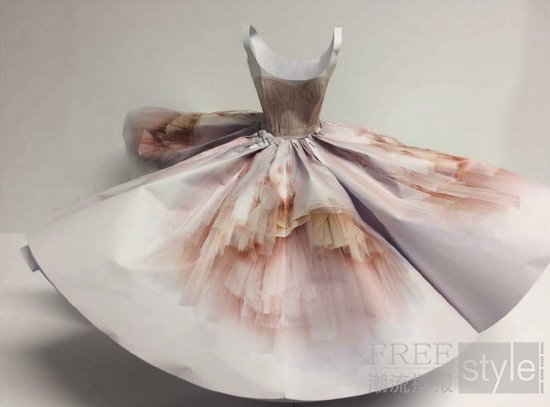 裙摆上的色调一旦确定后,经过数字化印制,赋予其立体质感。带骨薄纱紧身胸衣经扁平化数字扫描后,以立体化的视觉效果呈现在叠层薄纱裙摆上。
