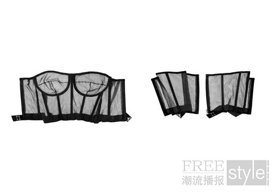 以浅粉色针织面料织就的紧身胸衣,廓形更为立体,刚柔并济。另一款上白色棉质缝线勾勒出紧身胸衣的廓形,以强烈的对比感,点缀于柔韧的黑色皮革之上。