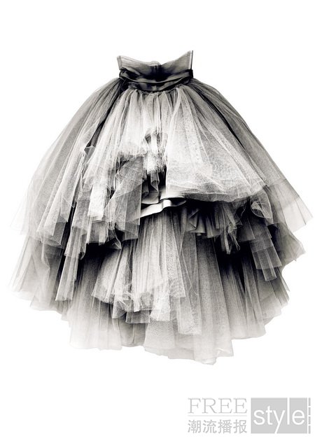 将经过数字化扫描处理的标志款黑色带骨薄纱紧身胸衣,和薄纱裙摆的摄影图案,分别印在叠层针织裙摆和纤维罗缎上。