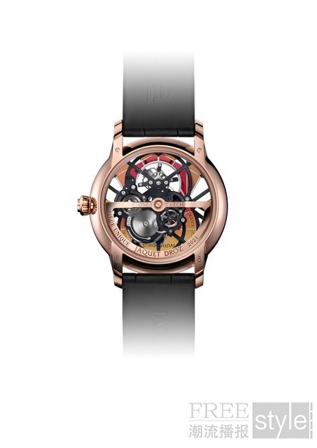 全新腕表的美学构造彰显了雅克德罗的高超技艺与别样匠心。镂空结构焕然一新:此前推出的镂空腕表多以优美柔和曲线著称,而该腕表则专注直线和角度,更加富有现代感和对称性。正如腕表高精度的陀飞轮装置,其镂空设计同样极具当代特色并彰显高超工艺,令技术与美学在腕表中得以珠联璧合。哑光的黑色镂空表桥更是增添了强烈的视觉效果。陀飞轮笼架与镂空机芯的几何美学相得益彰,以三重十字造型在每一分钟与表桥遥相呼应。