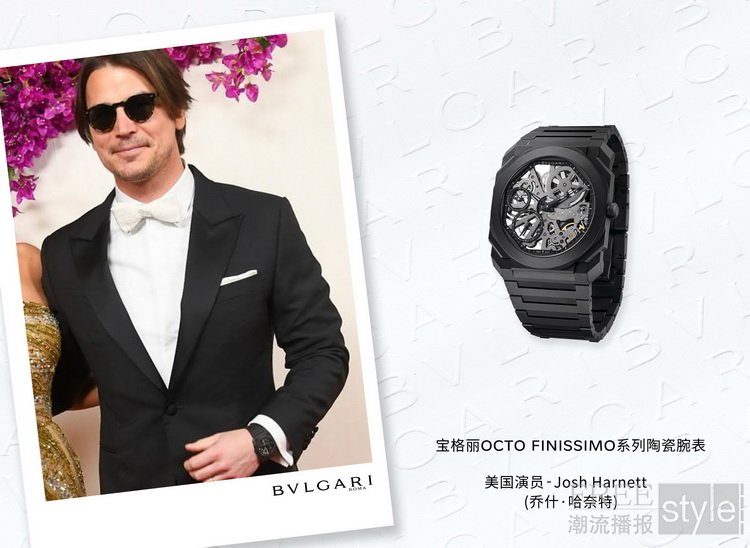 美国演员乔什•哈奈特(Josh Harnett)佩戴宝格丽Octo Finissimo系列腕表亮相颁奖典礼,黑色陶瓷材质搭配精妙的镂空结构,尽显洒脱不羁的风度。