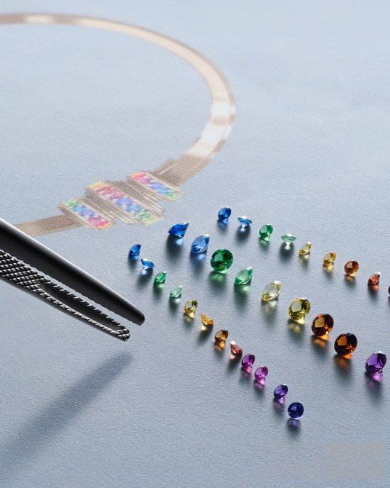 彩虹式镶嵌工艺对精度的要求近乎苛刻,必须达到毫米级标准。每颗宝石——无论是钻石、红宝石、蓝宝石还是沙弗莱石——都由PIAGET伯爵的宝石学家以极致眼光逐一甄选,确保色彩过渡如彩虹般自然流畅。这不仅是一项技术挑战,也与PIAGET伯爵另一标志性工艺——宫廷式图腾装饰(Decor Palace) 相得益彰。这一金工技艺由PIAGET伯爵于1961年首创,在2000年初,这一非凡设计又于制表历史典藏中被重新发掘。这项金工技艺在珍贵的黄金材质上精心雕刻出独特的不规则纹理,呈现绚丽迷人的光影效果。由于每位工匠技艺的微妙差异,每一件作品都成为不可复制的艺术珍品,延续了PIAGET伯爵作品与生俱来的迷人特质。