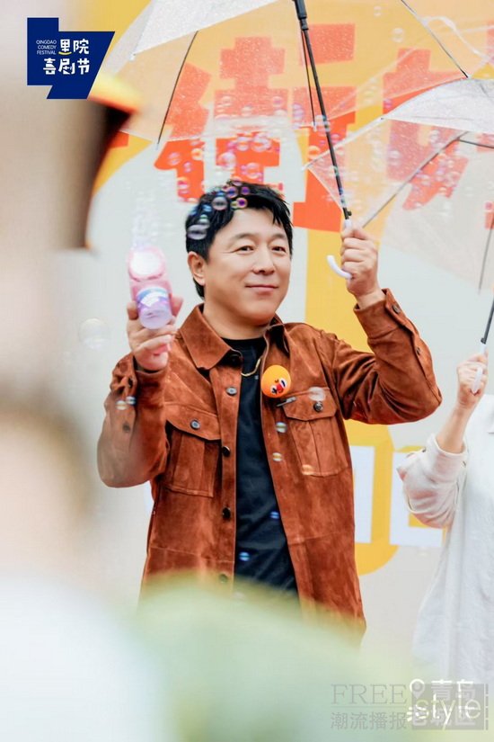 2025 年 9 月19日,中国青岛 — 黄渤身穿Brioni布里奥尼2025秋冬系列皮革Vagabond衬衫式外套搭配藏黑色海岛棉T恤,出席第二届里院喜剧节。