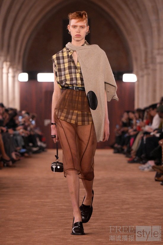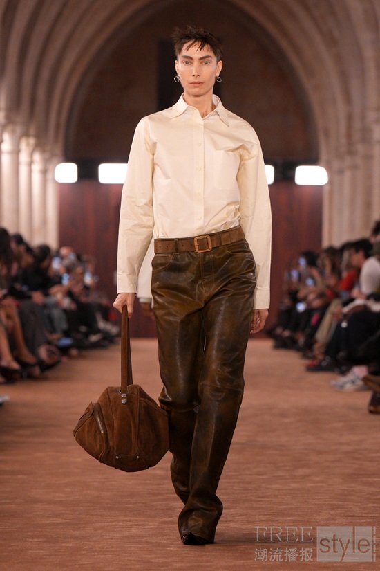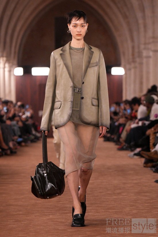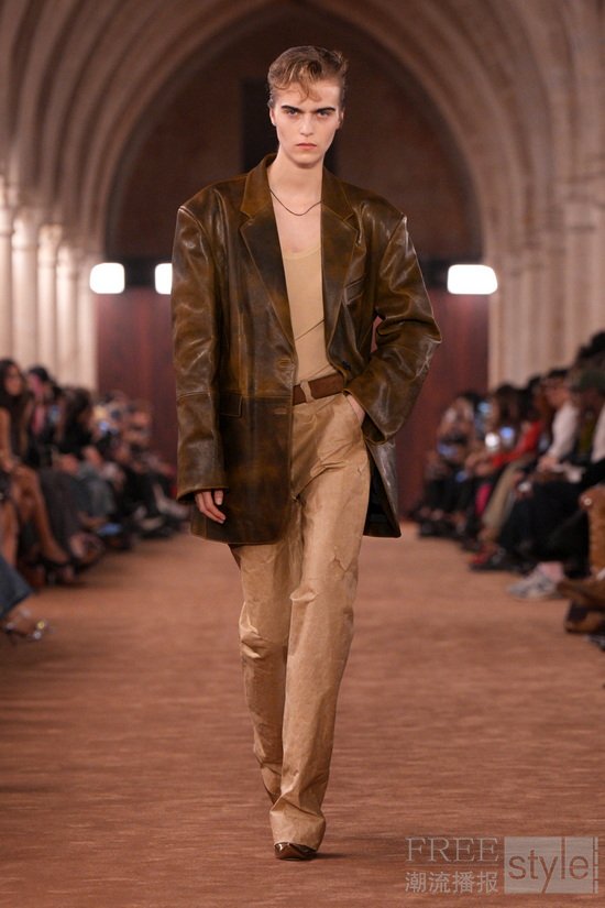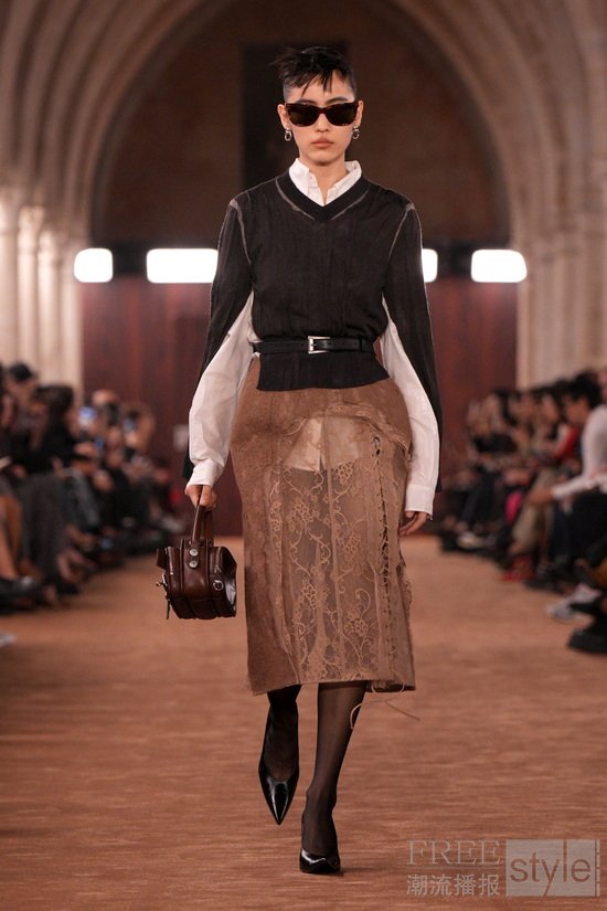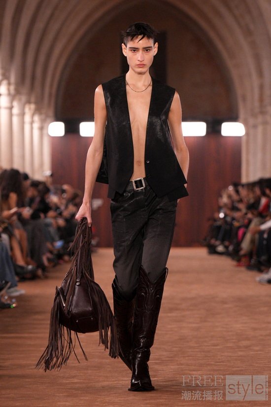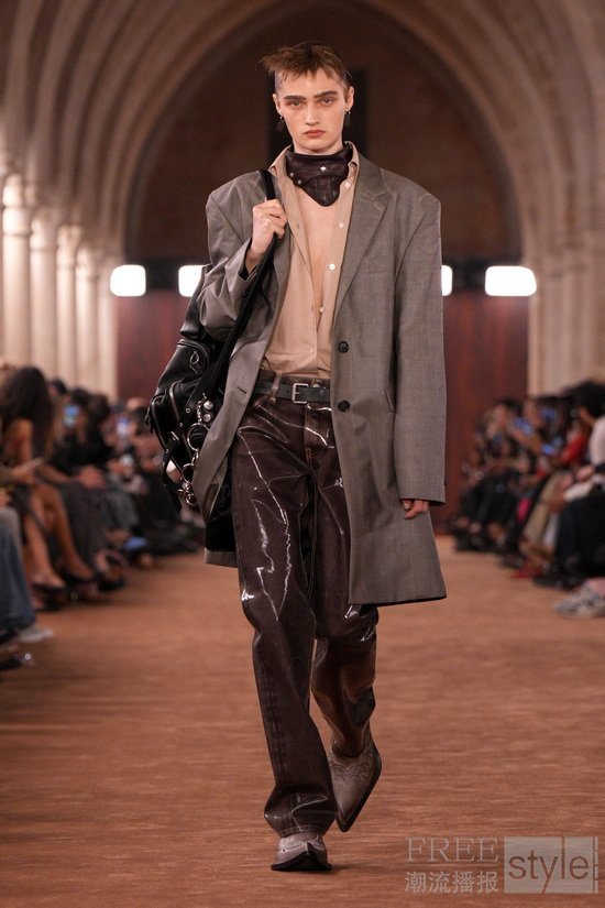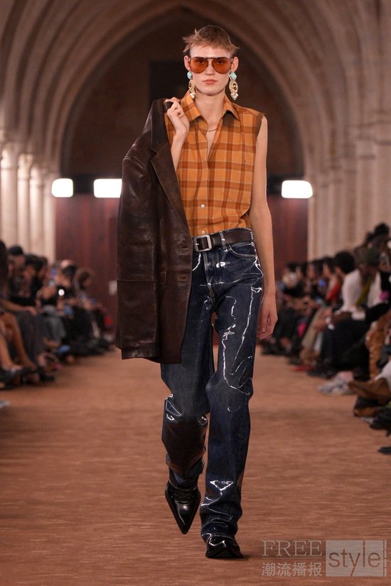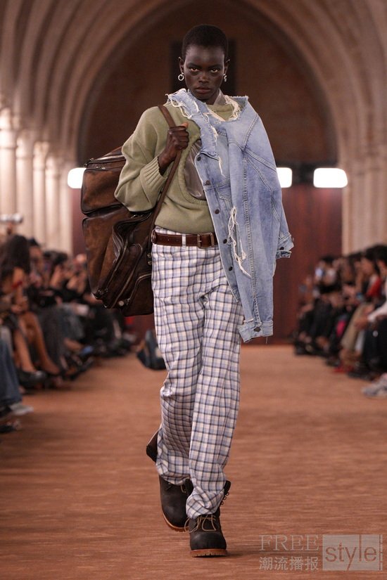 透明感以对比方式被重新演绎:法兰绒格纹衬衫搭配薄纱吊带裙。柔和府绸经水洗后呈现随性褪色之感,而皮革与麂皮则以打蜡或喷绘工艺处理,仿佛因劳作而自然变旧。精细针织层叠于内,外搭粗针织镂空毛衣,创造出别样造型。牛仔裤被撕裂、解构重组,形成极具触感的型态;丹宁表面叠加出纸质般的脆响质感;直筒“1996”版型则以乳胶工艺打造出磨损与橡胶化的顺滑触感。