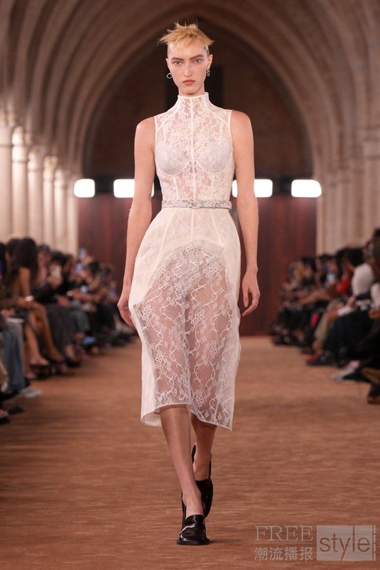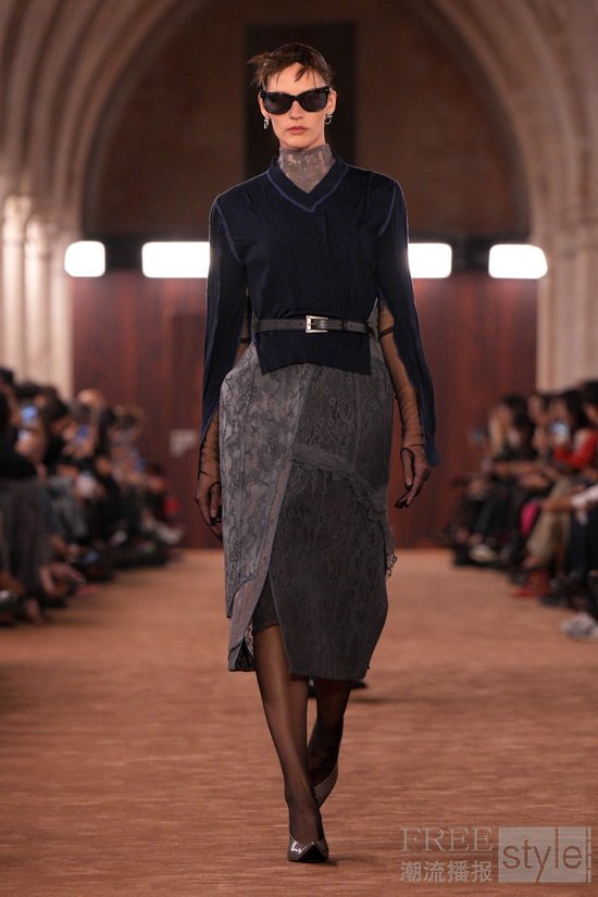 身份在此是流动的而非固化——提供了探讨关于自信女性气质既有观念的契机。人物形象充盈着 强烈的中性张力。错位的西装夹克与制服衬衫塑造出自信而从容的姿态;而拼接构成的高级定制蕾丝,则以宛若第二层肌肤般的雕塑感造型呈现,彰显并挑战工艺的珍贵。