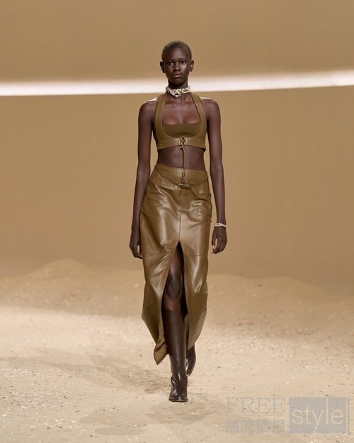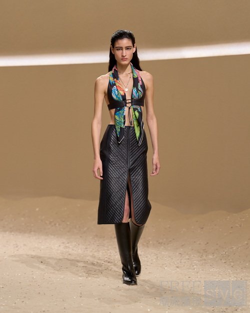 真丝方巾随性折叠为上衣,由皮革胸衣束裹,亦或化作雕塑感颈饰,与项链交织映衬。灵思巧构的组合式叠穿意在呈现而非掩映身姿之美。