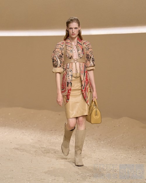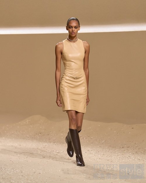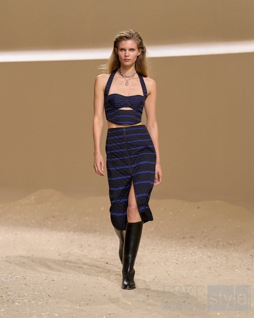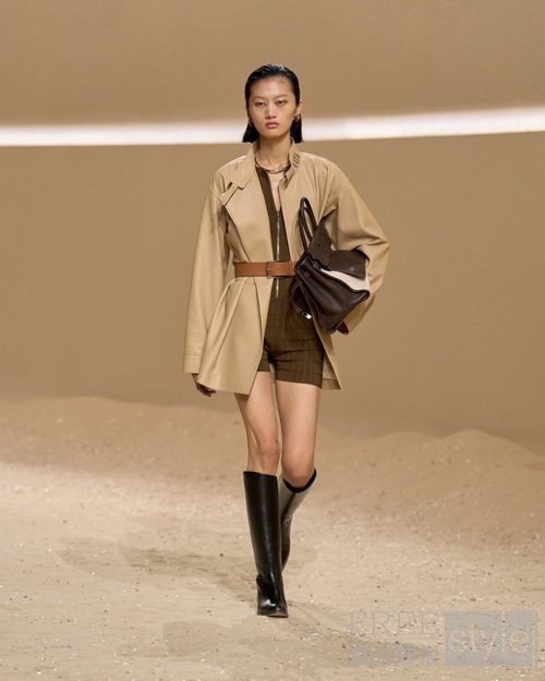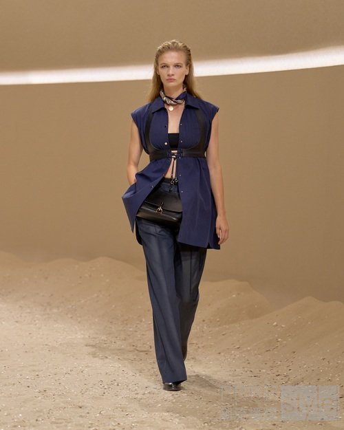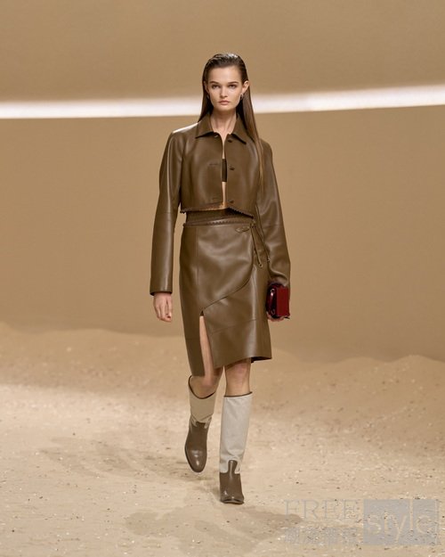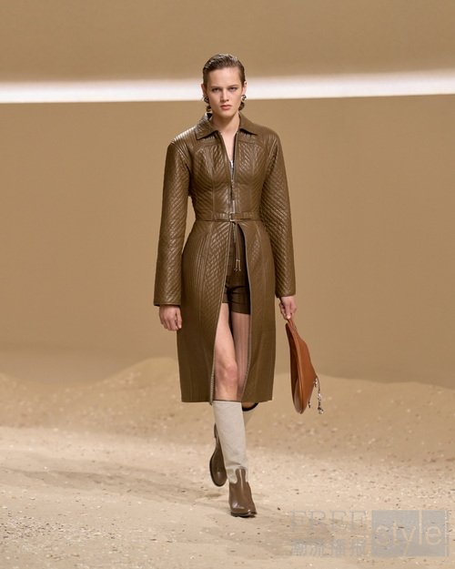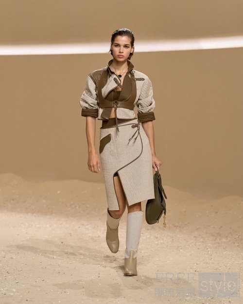 手工涂蜡皮革勾勒曼妙弧度;束带、搭扣与环饰将功能性与手工艺巧妙融合;绗缝工艺致敬皮革工艺与悠久的布提刺绣。为活动自如而设计的短款骑士夹克与绗缝亚麻帆布不对称半裙相映成趣;飘逸防风大衣灵感源于战壕风衣,以束带收紧腰身,呼应正装剪裁法则,亦诠释马术精准美学。