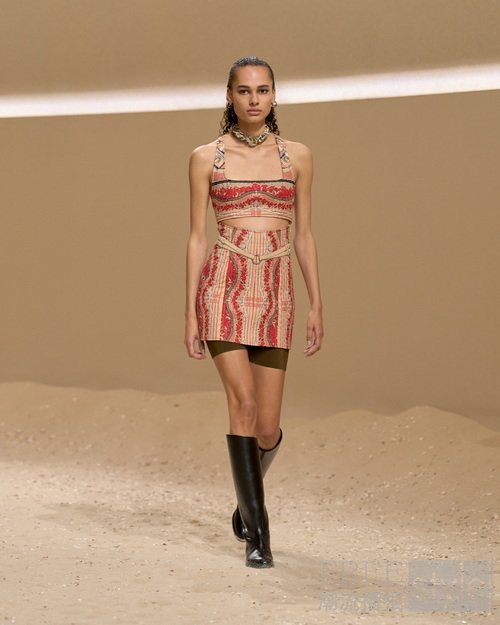 胸衣承托流动垂褶廓形,撷Aux champs en fleurs 方巾的灵动图案点缀。贴合身形的绗缝连衣裙汲取束身衣灵感,腰带与系绳环绕其上,搭配骑行短裤,交融传统工艺与运动活力。