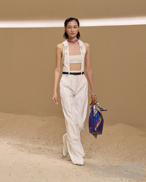 工装背带裤以清爽挺括的棉质剪裁而成,饰以马具式束带,氤氲海洋气息。轻透海魂针织衫任由阳光轻抚肌肤;Méditerranée 印花的手绘笔触流转于柔美廓形,与绗缝工艺交织为律动肌理。
