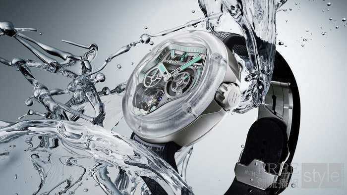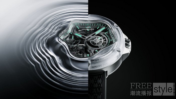 蓝宝石(用于制作雾面处理的盒形表圈)、钛金属与橡胶这些原材料的选择,充分体现了宇舶表“融合的艺术”制表理念的精髓,并为塑造腕表的灵感源自流水的自然造型奠定了基础。全新腕表的标志性特征无疑是表盘上惊艳的水花造型开口——这正是从MP-16 Arsham Droplet怀表的水滴灵感升华而来。
