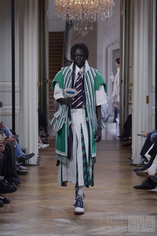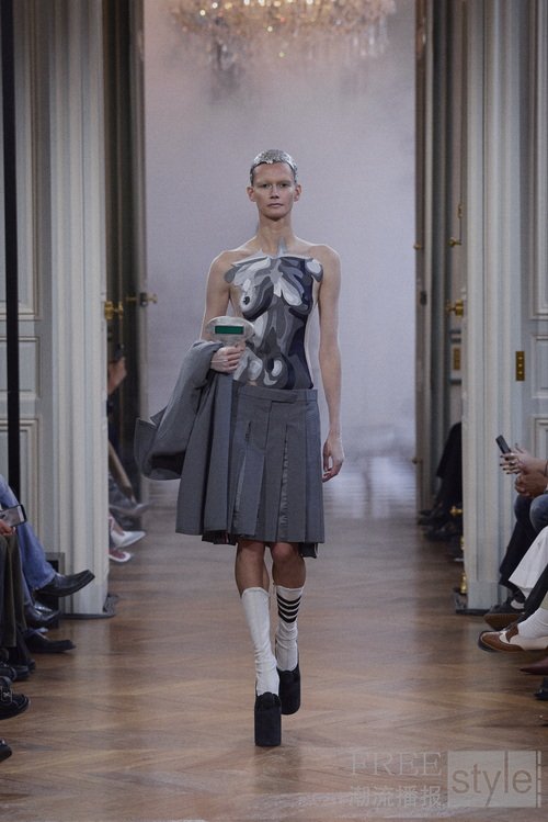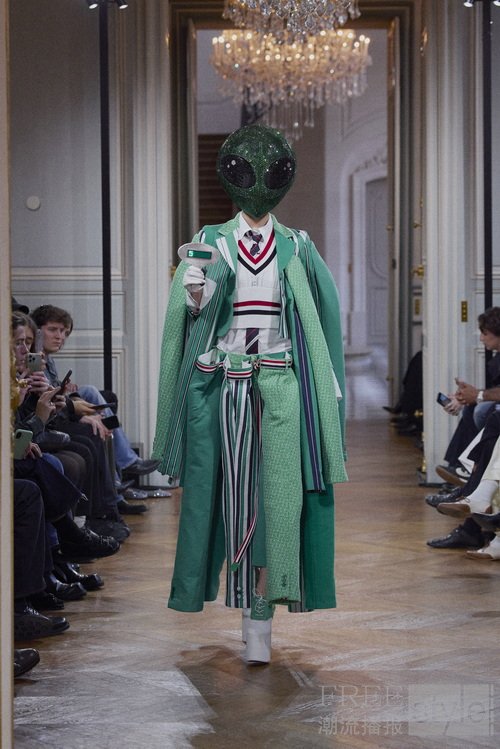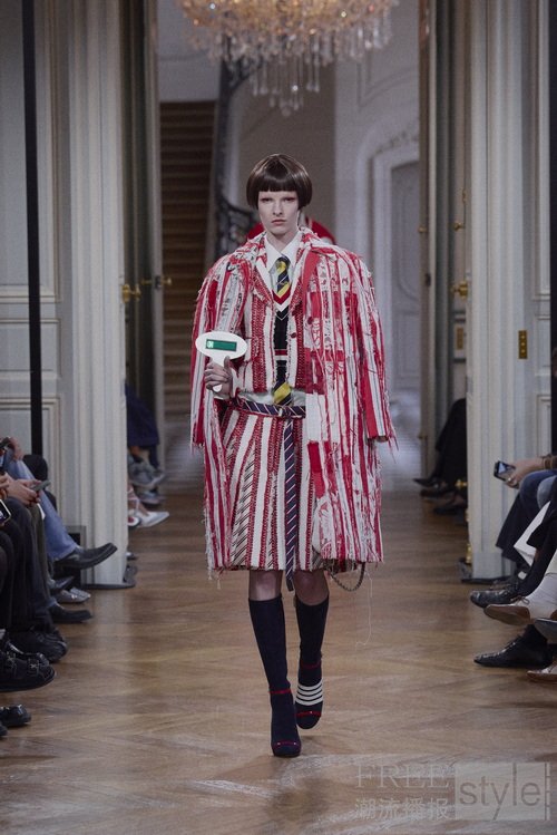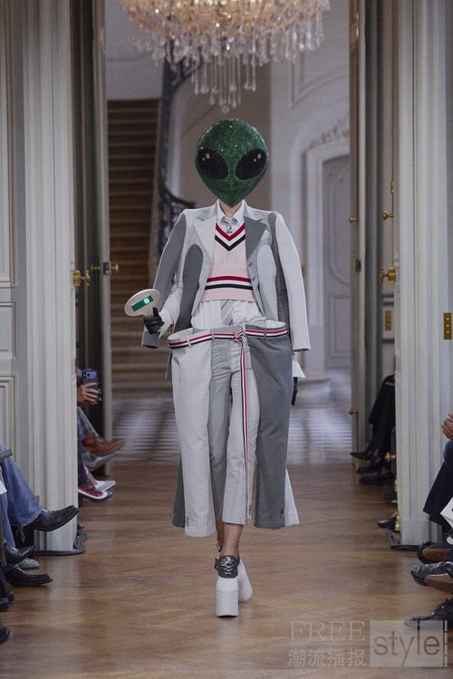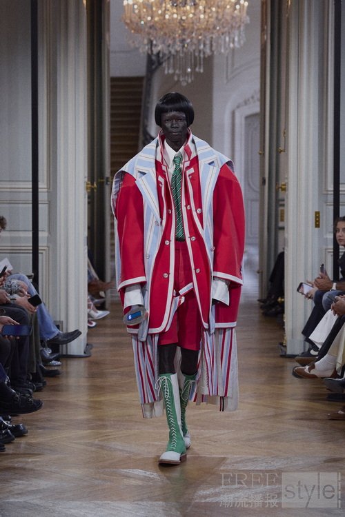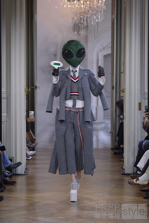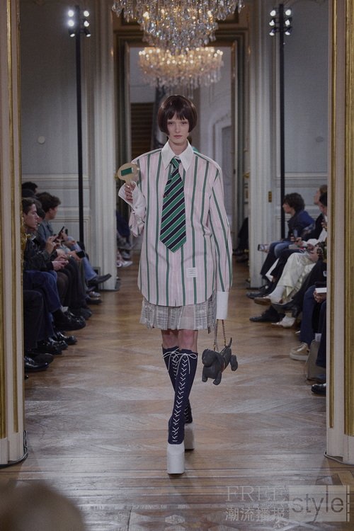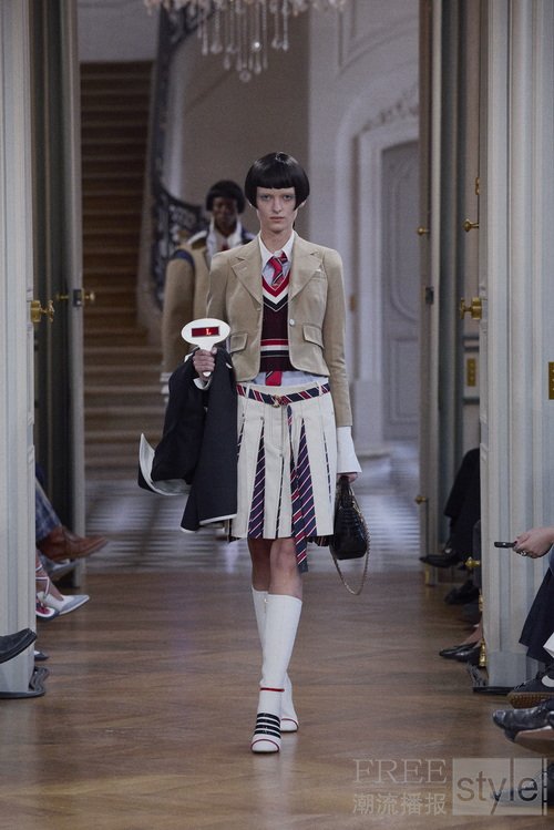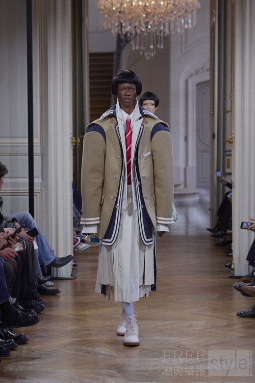 运动西装外套突破经典,以凌厉的全新廓形呈现,肩线扭转前倾,形似插肩袖,向经典学院风与美式运动服所代表的传统符号致意。挺括肩部更加强势,腰线内收,下摆则设计为结构化外展,呈现thom对精裁服饰与正装美学的全新表达。裙装腰线降至低腰并以腰带束拢,褶裥于膝间轻柔垂坠。内搭的板球针织衫——作为thom browne标志性设计元素——被缩裁截短,构成新比例。