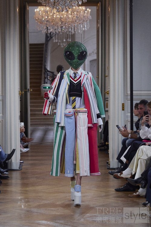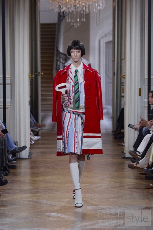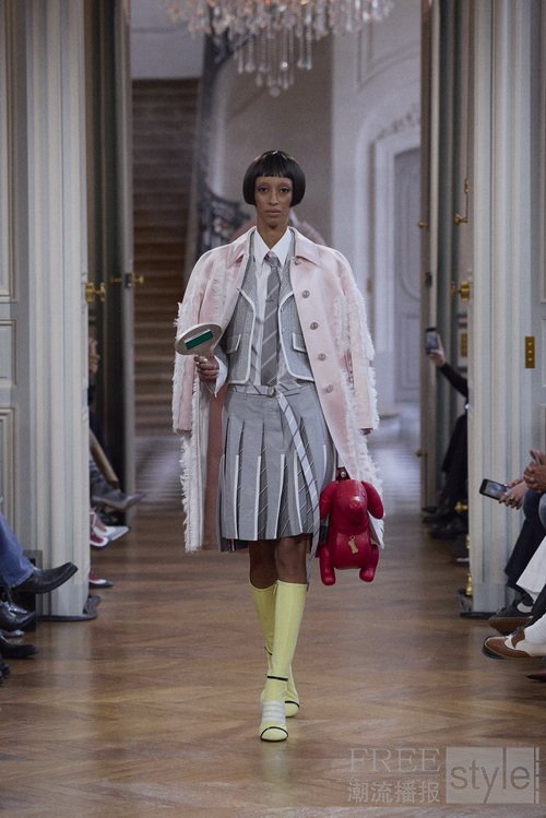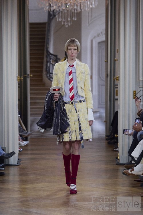 明快的学院风色调强化视觉对比。罗纹斜纹以编织、刺绣、叠加的多元形式呈现,将thom过往二十余年的经典技艺推向极致。粗花呢搭配泡泡纱,交织点缀以纯银扣环,镶边拼布与亮片薄纱微微闪烁着光谱信号般的流光…
