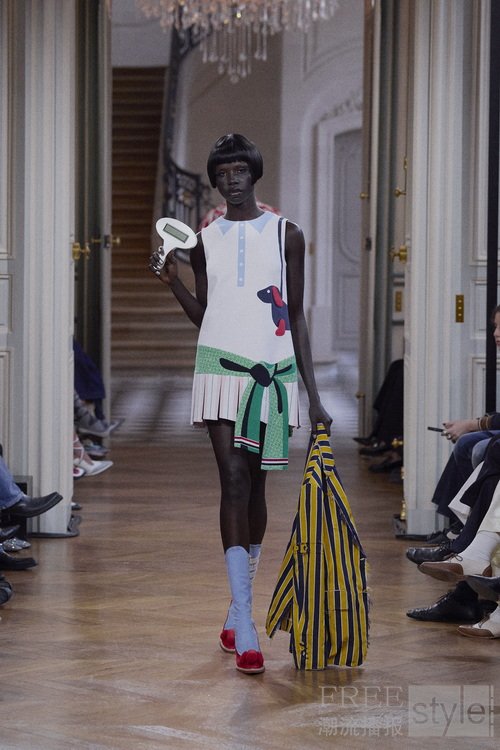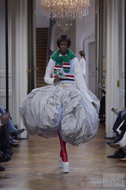 靴履以拼色营造视觉幻象,真实与超现实的界限愈发模糊。搭配浅彩袜子的细带高跟鞋,实际却是一双柔光粉彩闭口靴。厚底高跟鞋与拼色系带靴在秀场宅邸中列队穿梭。