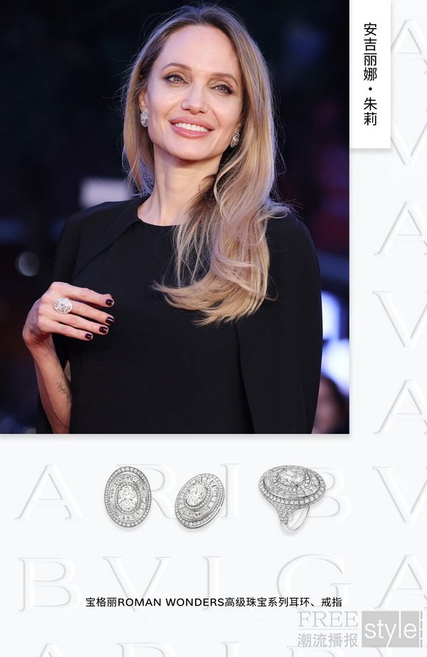 美国女演员安吉丽娜·朱莉(Angelina Jolie)以一袭黑色连衣裙搭配宝格丽Roman Wonders高级珠宝系列亮相第二十届罗马电影节。指间一枚镶嵌椭圆形钻石及20颗阶梯形切割钻石的高级珠宝戒指璀璨夺目,同系列耳环于耳畔熠熠生辉,映衬从容自信之姿。