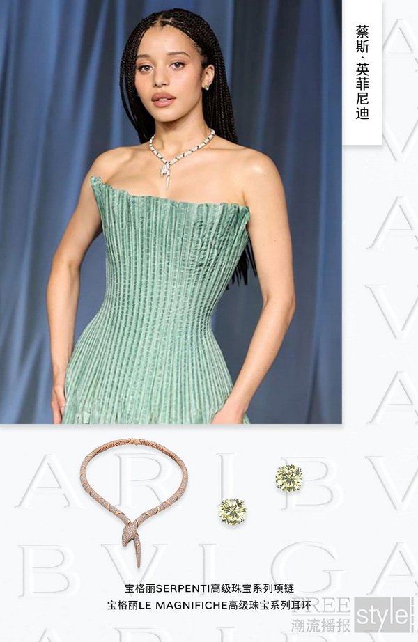 美国演员蔡斯·英菲尼迪(Chase Infiniti)佩戴宝格丽Serpenti高级珠宝系列项链出席洛杉矶电影艺术博物馆举办的第五届学院博物馆慈善晚宴。颈间项链从古老文明中的“衔尾蛇”造型汲取灵感,水滴型切割祖母绿点缀蛇眸,密镶钻石与金属材质交织,勾勒出灵蛇曼妙之姿。耳畔的Le Magnifiche高级珠宝系列耳环点缀整体造型,举手投足间尽显利落时髦的现代格调。