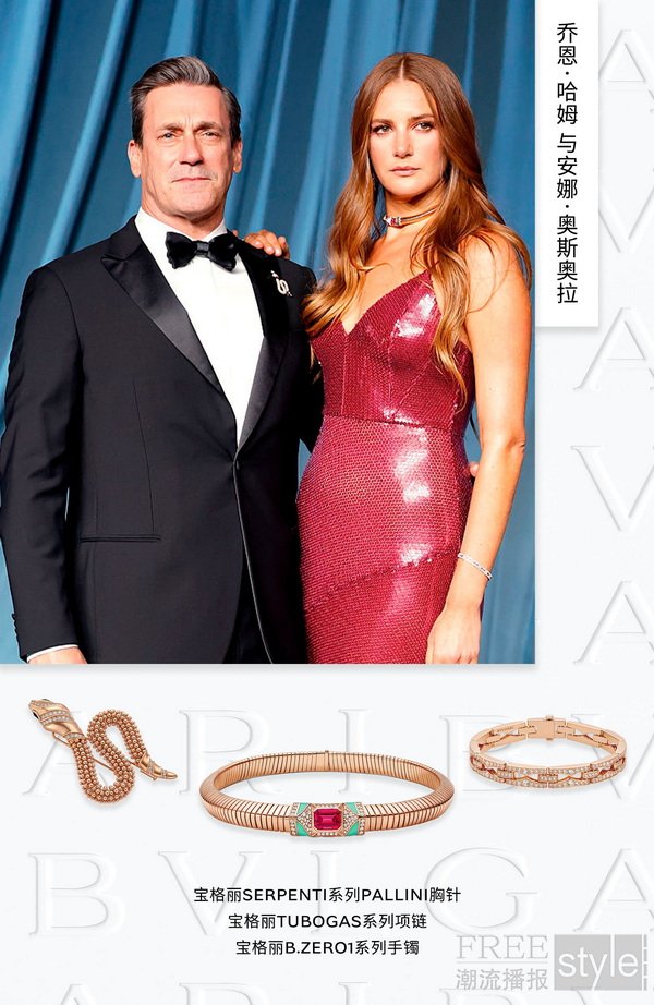 美国演员乔恩·哈姆(Jon Hamm)与安娜·奥斯奥拉(Anna Osceola)佩戴宝格丽作品出席第五届学院博物馆慈善晚宴。乔恩·哈姆胸前佩戴一枚宝格丽Serpenti系列Pallini胸针,蛇头和蛇尾交替饰以抛光玫瑰金和钻石,灵动的金珠工艺让金属光影自然流转,尽显雅致。安娜·奥斯奥拉佩戴宝格丽Tubogas系列项链为造型点睛,中央醒目的红碧玺与红色长裙默契呼应,腕间B.zero1系列手镯以密镶钻石折射出熠然光芒,尽释女性的卓然风姿。