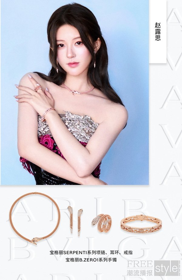 宝格丽品牌代言人赵露思佩戴Serpenti系列项链、耳环及戒指,Pallini金珠工艺赋予作品灵动质感,举手投足间皆传递意大利匠艺精髓;腕间B.zero1系列手镯与之交相辉映,光华流转间诠释自信魅力,传递源自罗马的意式生活欢悦。