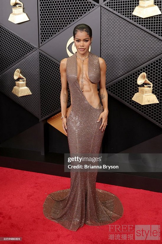 歌手缇雅娜·泰勒(Teyana Taylor)身着由品牌创意总监 Haider Ackermann 设计的 TOM FORD 服装亮相于洛杉矶举办的格莱美颁奖礼。